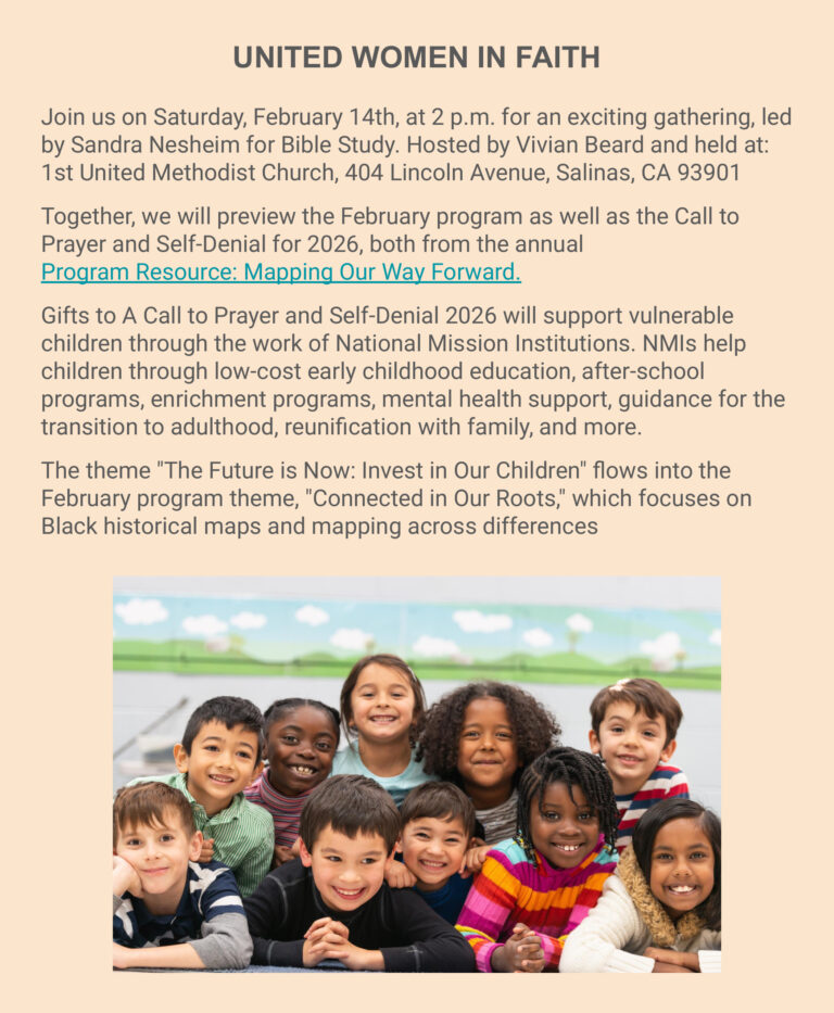 | February 8, 2026 | 10:00 am - 11:00 am | 5th SUNDAY after EPIPHANY SERVICE Location: OLDTOWN CAMPUS, 404 Lincoln Ave, Salinas, CA 93901 iCal download |